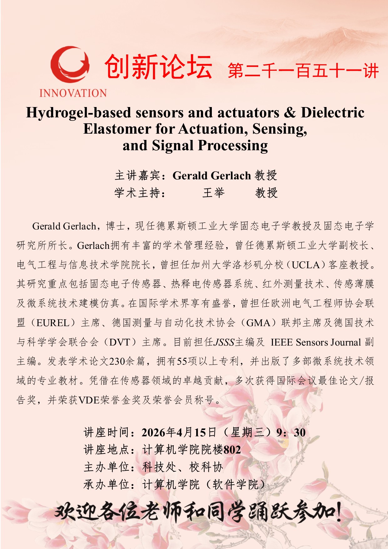 西北大学创新论坛第二千一百五十一讲:Hydrogel-based sensors and actuators & Dielectric Elastomer for Actuation, Sensing, and Signal ProcessingGerald Gerlach计算机学院院楼8022026-04-15 09:30:00