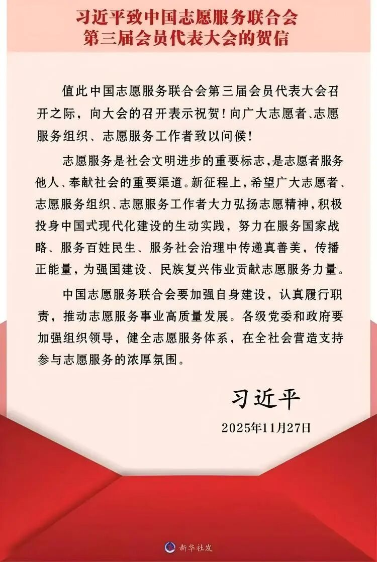 近日,中国志愿服务联合会第三届会员代表大会在北京召开,中共中央总书记、国家主席、中央军委主席习近平发来贺信,向大会召开表示祝贺,向广大志愿者、志愿服务组织、志愿服务工作者致以亲切问候,对志愿服务事业发展提出殷切期望。