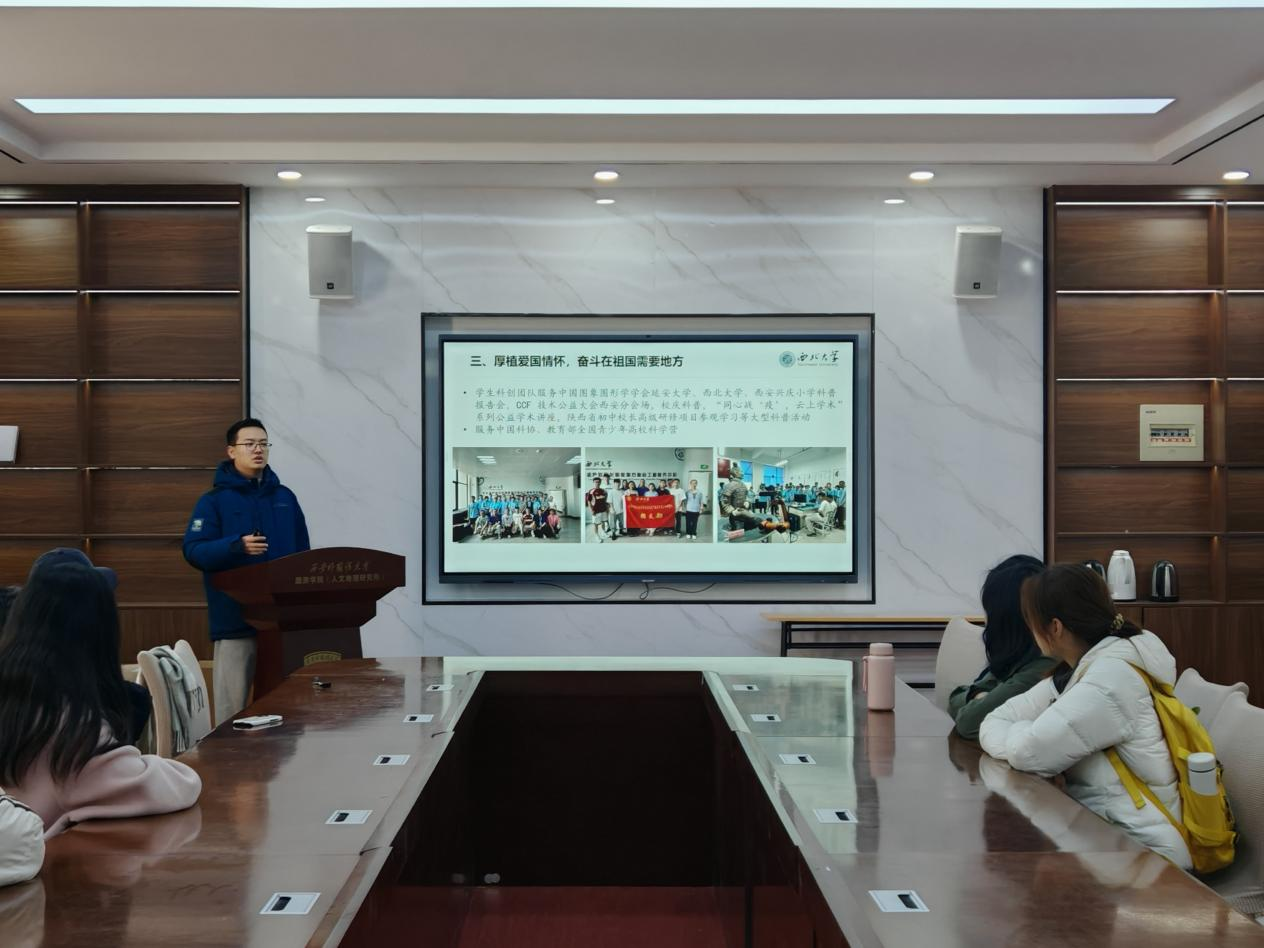 随后,与会全体成员前往西安外国语大学H206会议室,开展交流活动。西安外国语大学张珂欣,西北大学计算机学院(软件学院)兼职辅导员、学生团委副书记秦钰林,分别介绍了双方学生科创团队的基本情况。