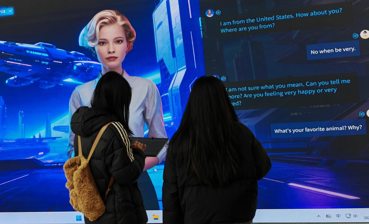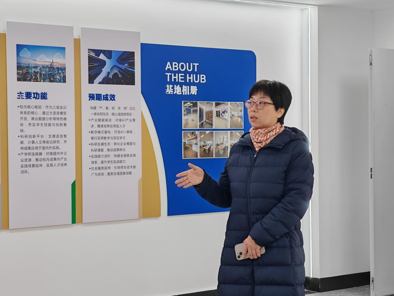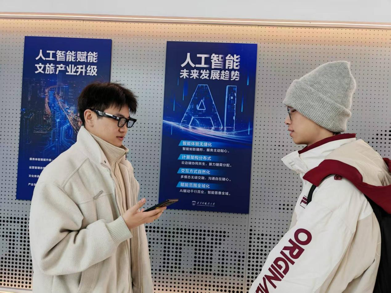同学们还体验了VR眼镜、语言学习数字人等设施,体会AI+语言学在文旅、教育等行业的应用,结合寒假社会实践的项目内容,深入理解了技术研发与行业落地的关系,在实践中明确未来学习方向。