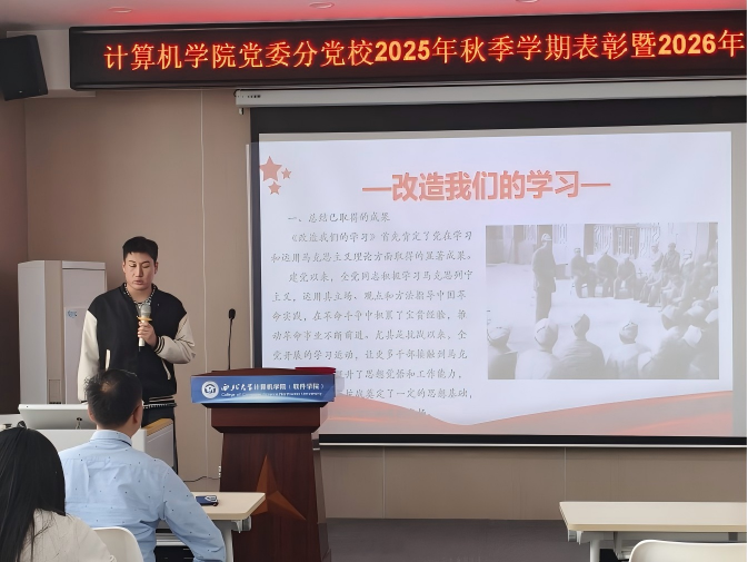 最后,学院党委副书记、分党校校长贾文涛作总结讲话。他首先代表学院党委,向全体学生干部在上一学期的辛勤付出与扎实工作表示衷心感谢,对大家在党务工作中展现出的责任担当予以充分肯定。他说分党校作为学院党建育人的重要阵地,要立足计算机学科专业特色,积极策划、组织有学院辨识度的党建活动,推动党建工作与专业发展深度融合;全体学生干部要充分发挥先锋模范带头作用,在做好党务工作的同时,紧抓学习与科研,以自身行动带动身边同学形成勤学善思、笃行实干的良好氛围,切实把党务工作的成效转化为个人成长与学院发展的动力。