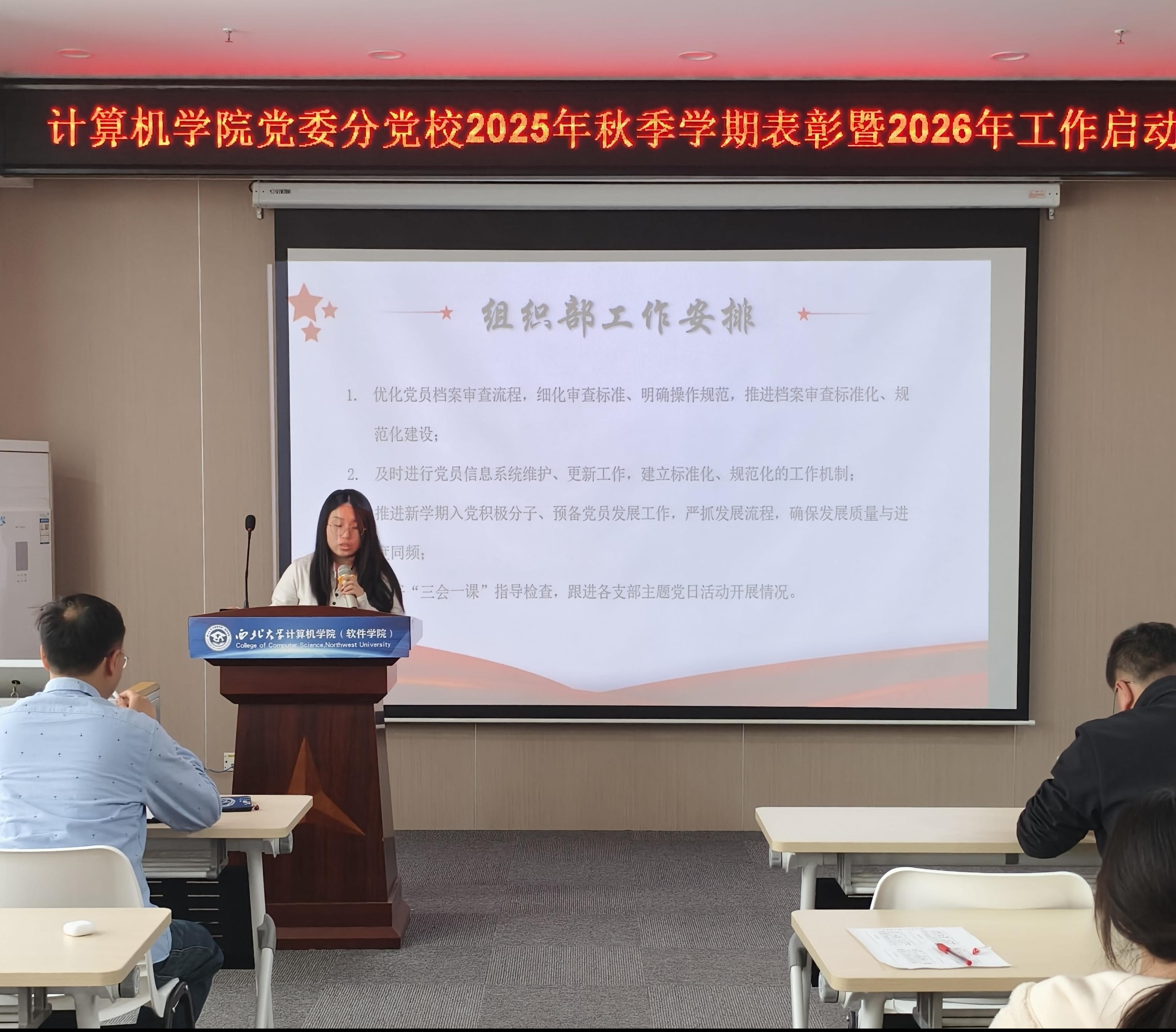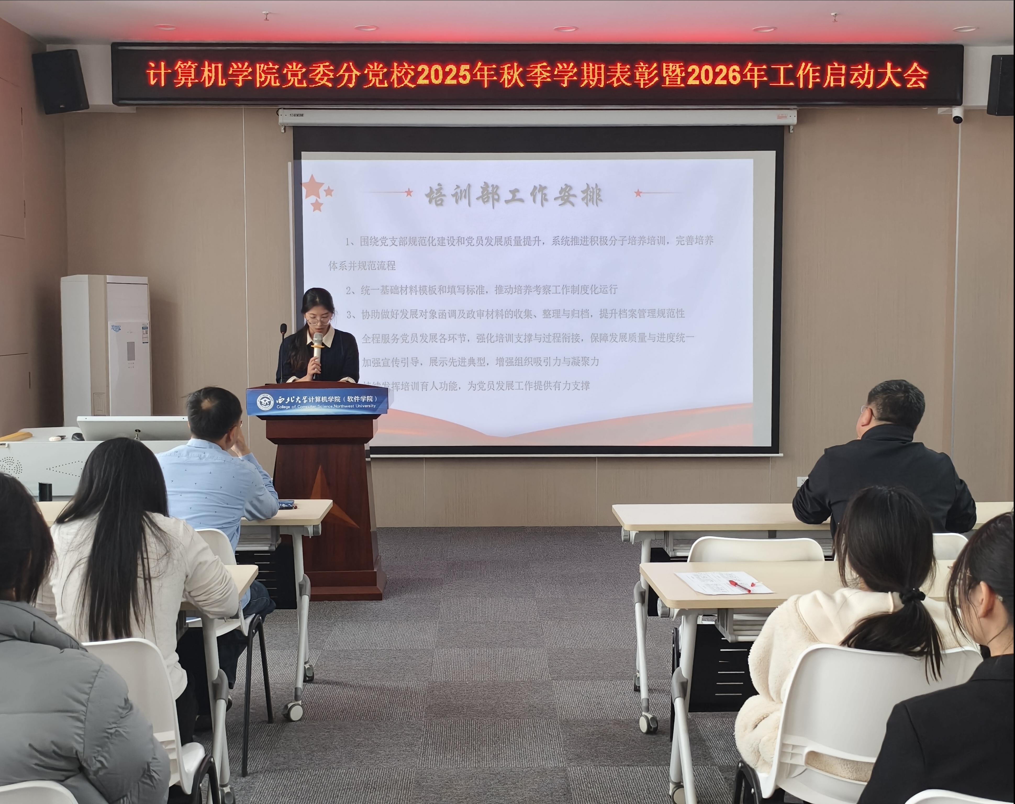 表彰结束后,分党校组织部、培训部、实践部、宣传部部长依次上台,围绕新学期各自部门核心工作进行详细介绍,分别明确了档案规范、党员发展、培训培养、党性实践、宣传育人等方面的重点任务与具体举措,确保新学期各项工作有序推进、落地见效。