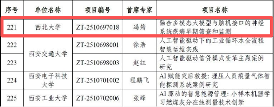 近日,教育部学位与研究生教育发展中心正式公布2025年度主题案例立项结果。由我院冯筠教授牵头申报的“融合多模态大模型与脑机接口的神经系统疾病早期筛查和监测”项目成功入选“人工智能+”主题案例。这是我院在人工智能与医疗健康交叉融合领域,推动专业学位研究生课堂落地实践取得的重要成果。