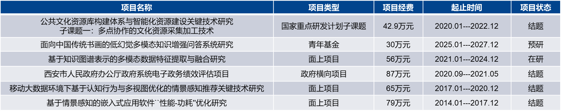 参与国家科技支撑计划课题2项,国家重点研发计划项目1项;主持陕西省教育信息化研究项目:校园信息化基础设施效益评价体系研究、基于11N.SF任务框架的多模态校园一卡通系统设计与数据分析研究、陕西省教育专网推进研究等;主持校级信息化建设研究课题2项。发表学术论文十余篇。