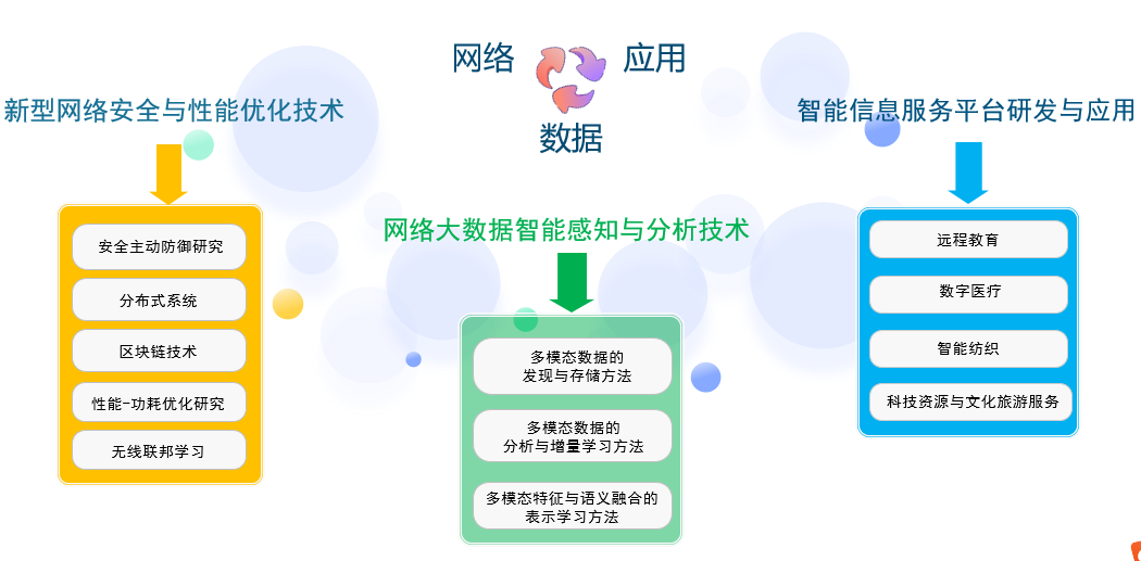 目前团队主要围绕网络、网络中的数据以及在网络条件下的基于大数据的应用展开,包括网络安全与性能优化技术,针对网络环境本身、分布式组网、区块链技术以及联邦学习等新型网络技术的研究与优化;网络大数据智能感知与分析,利用深度学习相关先进技术对网络环境中的多模态数据进行特征提取与表示优化,并设计算法分析和使用多模态数据;智能信息服务平台的研发与应用,偏向于应用开发,包括在数字医疗、工业智能纺织、科技资源、文化资源等方面。