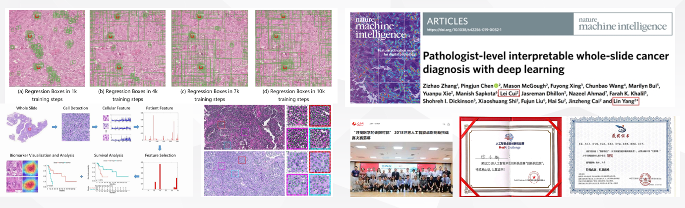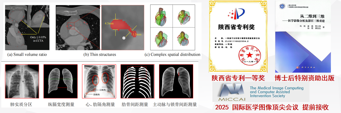近年来,团队在医学影像分析、多模态文本分析、古生物数字化、智慧交通等领域成果丰硕。其中,胸腹部医学图像智能分析关键技术研究与应用获2023陕西省高等学校优秀成果特等奖;颅面复原技术获陕西省专利奖一等奖;数字病理图像智能分析研究成果发表于Nature子刊,获国际卓越挑战赛优秀奖。团队构建了融合虚拟场景交互与多维度脑电信号解析的研究,完成两项国家重大研发计划子课题的研究任务,用于医院的脊椎康复和儿童认知评估等领域。团队研发了面向胰腺肿瘤治疗的高压脉冲消融手术规划智能辅助决策系统,可为手术方案制定提供智能化支持;针对 PACG(原发性闭角型青光眼)的临床前期筛查及视神经损伤力学分析系统,可同时实现疾病早期筛查与损伤机制的力学分析,为眼科疾病诊疗提供技术支撑。