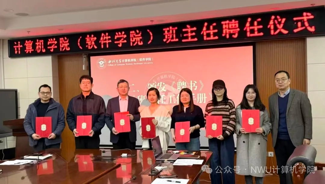 仪式上,陈晓江院长首先宣读班主任聘任决定。经个人自主申报、学院严格遴选、学校人力资源部审核备案,学院正式聘请陈晓江、许鹏飞等7名同志担任2025级各班班主任。随后,赵万峰书记为新聘任班主任逐一颁发《聘书》及《班主任工作手册》。贾文涛副书记现场宣读了《计算机学院(软件学院)本科生班主任工作实施细则》,进一步明确了班主任的工作职责与管理要求。