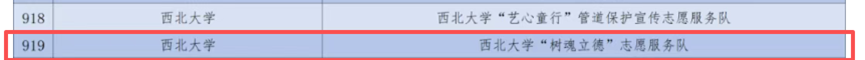 西北大学“树魂立德”志愿服务队是一支具有光荣传统与突出业绩的青年集体。团队曾成功承担中华环境保护基金会、省教育厅、省慈善协会等多个重点项目,并荣获省级项目一等奖。由团队参与开发的“强国复兴”专题团课,成功入选共青团中央基层建设部团员和青年主题教育资源目录。团队中涌现出一批荣获国家奖学金、省级优秀学生干部、西北大学优秀共产党员、志愿服务西部先进个人等荣誉的优秀成员,并有多人入选中国青年志愿者扶贫接力计划研究生支教团及西北大学青年先锋宣讲计划。其志愿服务事迹曾获中国青年网、陕西日报等权威媒体的广泛报道。